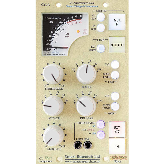 The Smart Research C1LA B-Stock is a two channel compressor/limiter, released to commemorate the 25th anniversary of the original C1 Stereo/Dual Mono unit, and the 50th anniversary of North American distributor, Sunset Sound. It is a versatile unit, housed in a two-module wide 500-Series format, with three main modes of operation offering a range of possibilities. It can be used for all stereo or single channel signal applications: as a main mix bus compressor; for sub-mixes; or for tracking either mono or stereo sources.